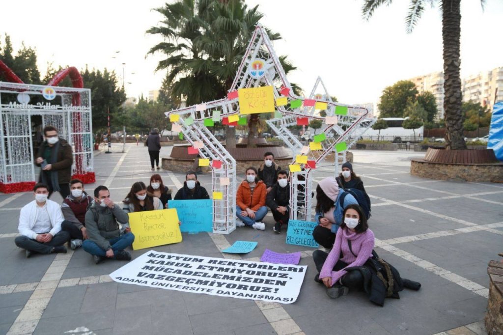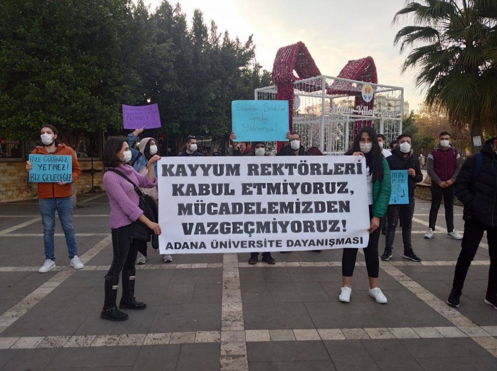 Adana Üniversite Dayanışması saat 17.00’de Gençlik Meydanı’nda bir araya gelen üniversiteliler burada ellerinde tuttukları “Kayyum rektörleri kabul etmiyoruz. Mücadelemizden vazgeçmiyoruz!” yazılı pankart ile kayyum rektör istemediklerini dile getirdiler.